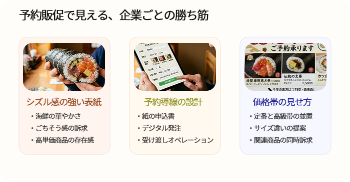 また、申込方法にも差があります。紙の予約票を中心にしているところもあれば、デジタル発注を取り入れているところもあり、売場だけでなくオペレーションの考え方までにじみ出ます。ヤオコー、ベルク、サミット、オーケー、セブンイレブンなど主要な食品小売各社を見比べると、同じ商戦でも「どこで勝負するか」が少しずつ違っていて、その企業らしさがよく表れていました。